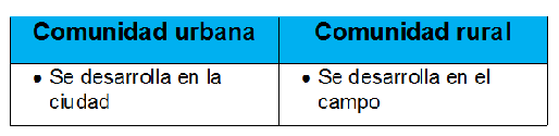 - Observa la imagen de los tipos de comunidades y escribe qué elementos tiene cada una.