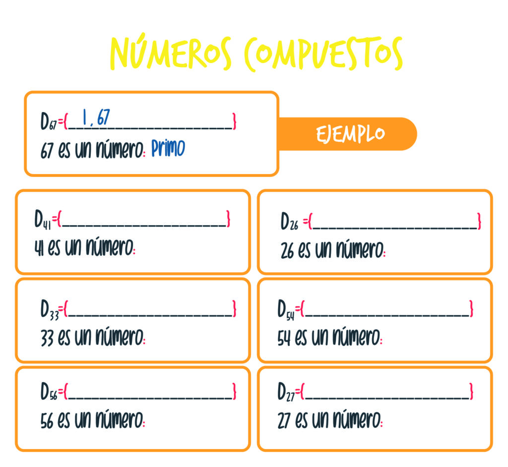 Completa el conjunto de factores de los siguientes números compuestos, guíate del ejemplo.
