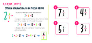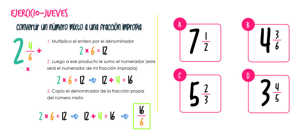Escribe cómo se representa cada fracción mixta al pasarla a fracción impropia, guíate del ejemplo, observa cada paso.
