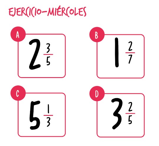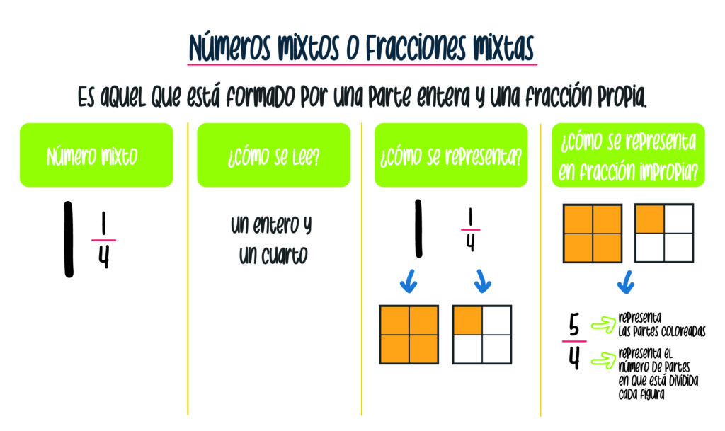 Guíate del cuadro del ejemplo del contenido y escribe ¿Cómo se lee?, ¿Cómo se representa? y ¿Cómo se representa en fracción impropia? cada número mixto dado.