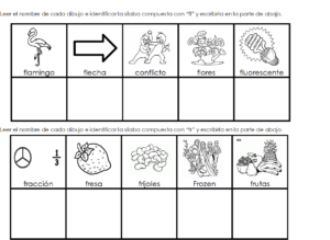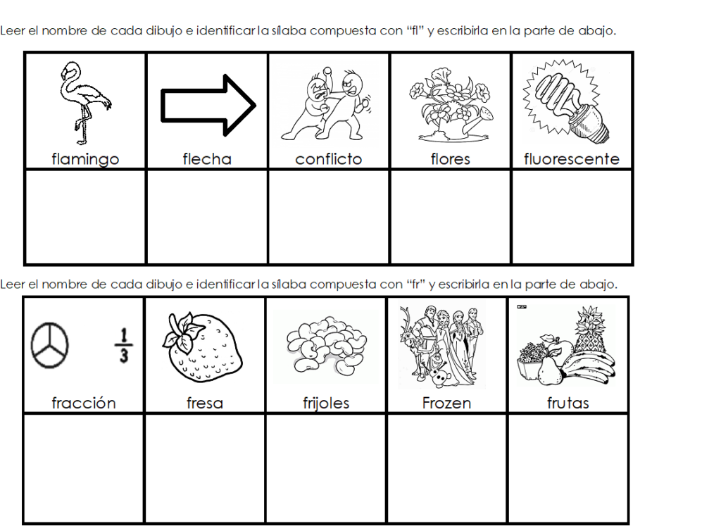 Identificar la sílaba compuesta fl – fr según el nombre de cada dibujo y escribir la sílaba en el espacio de abajo. Pegarlo en el cuaderno # 1. Luego trabajar en el libro.