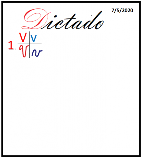 Dictado en el cuaderno #2, recuerda seguir los lineamentos para trabajar en el cuaderno: Título:” Dictado” en letra de carta mayúscula de rojo. Fecha en la parte superior derecha, numeración con rojo. En la número 1 se coloca la cruz para escribir la letra “v”, en la parte superior letra de molde mayúscula y minúscula y en la parte inferior letra de carta mayúscula y minúscula utilizando los colores correspondientes.